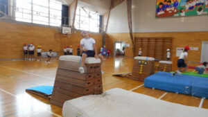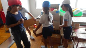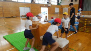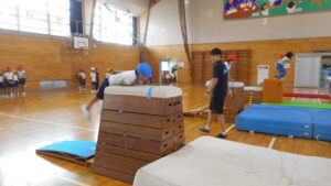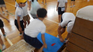 体育科の学習では、跳び箱の練習をしています。子供たちは最初、「こわいなあ」「できなかったら恥ずかしい」等の感想を抱いていましたが、”改造跳び箱”にして、楽しく跳ぶことができるようにしました。ロイター板を大きくしたり、ふわふわなマットを使ったりして、工夫しながら取り組みました。