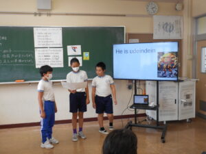 本日の授業では、「Who is this?」という表現を使って、自分たちが紹介したい人物やキャラクターについて、特徴をとらえて紹介し合いました。また、「He is kind.」「She has many friends.」など、英語表現を工夫しながら、友達に伝えようとする姿が見られ、楽しみながらも真剣に学ぶ様子が印象的でした。