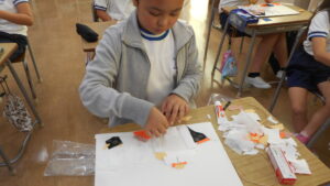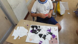 3年生は、図画工作科の学習「ぬのでえがくと」に取り組みました。いつも使っている紙とはちがう布の感触を楽しみながら、思い思いの色や形を描きました。絵の具が布ににじんでいく様子を見て、「ふしぎ!」「きれいに広がった!」と子どもたちは大喜び。布の上で筆を動かすうちに、表したいものや色の重ね方にも工夫が生まれていきました。できあがった作品からは、一人一人の豊かな発想や表現の広がりが感じられます。