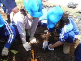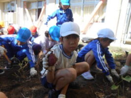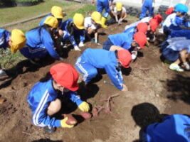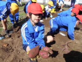生活科でさつまいも掘りを行いました。5月に植えたさつまいもの苗が大きくなり、収穫することを楽しみに待っていた2年生の子供たち。さつまいもが見えると「出てきた!」と嬉しそうに友達に伝え合う姿が見られました。土が硬く一人でさつまいもを掘ることが難しいと感じた子供たちは、「一緒に掘ろう!」と友達と協力し合い、掘り出せたときには喜び合い、達成感に溢れた活動となりました。