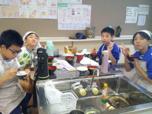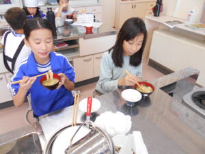 調理後は、みんなで「いただきます」。自分たちで作ったごはんと味噌汁は、いつもより何倍もおいしく感じられたようです。
