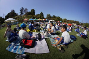 昼食は、なかよし班ごとに輪になってお弁当を食べました。ウォークラリーでたくさん歩いてペコペコでしたが、おいしいお弁当を食べてみんなニッコリ笑顔です。友達とお弁当を見せ合いながら会話を楽しみました。