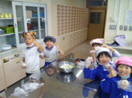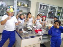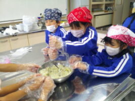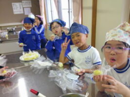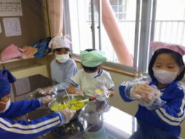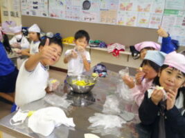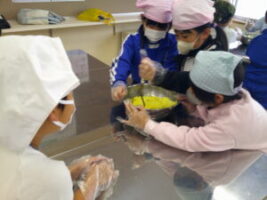 さつまいもの収穫が終わり、「お家でさつまいも料理を食べたよ」という話をたくさん聞きました。学校のさつまいもはどんな味がするのか、生活科の学習でさつまいもの茶巾絞りを作りました。さつまいものよい匂いに包まれながら、子供たちはさつまいもを潰したりこねたりして、「おいしくなぁれ」と気持ちを込めて料理しました。