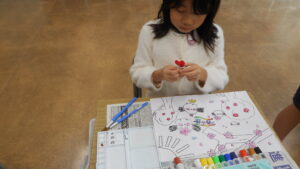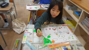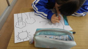 3年生は図画工作科で「ことばから思いえがいて」の学習を行いました。「ピラロ ルラ」「母さん鳥の子もり歌」「森のなかまにおはようと」等、いろいろな言葉からイメージをふくらませ、色や形で表しました。子供たちは、言葉を聞いて思い浮かんだ色や動きを自由に描き、絵の具やパスを使ってのびのびと表現していました。同じ言葉でも、一人ひとり違う世界が広がっており、見ている人も楽しくなる作品がたくさんできました。教室いっぱいに広がった色と形の世界。言葉から生まれる想像の豊かさを感じる時間になりました。