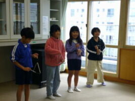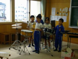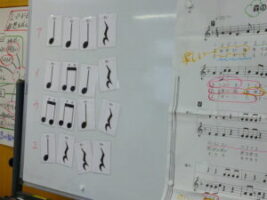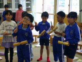 音楽科の学習で、「森のたんけんたい」を歌ったり、歌詞に合う楽器を選んで、リズムを打ったりする学習をしています。「きつつきがくちばしでコンコンコンと打っている様子をあらわすには、木の楽器がいいよ。ウッドブロック、クラベス、カスタネットとかがいいね」「たぬきがおなかをポンポンたたいているから、タンバリンや小太鼓がいいかな」「妖精が魔法を使っているよ。キラキラしている感じを出すために、トライアングルや鈴など金属の楽器がいいよ」など、歌詞をイメージして、楽器の音色や音の出し方を工夫しました。また、最後の小節では、自分たちが考えたリズムを打って、楽しみました。