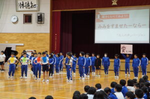 昨日は、全校で心をひとつにして歌う「歌声集会」が行われました。今回は特別ゲストとして、富山県西部の音楽部会の先生方、そして…美声戦隊歌声レンジャーが登場!