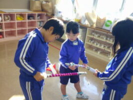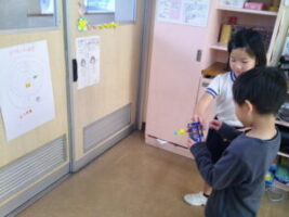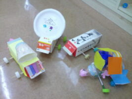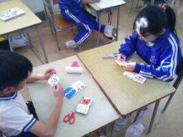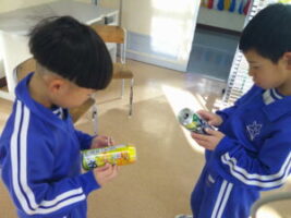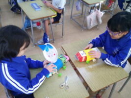 生活科の学習で、ペットボトルやアルミ缶、新聞紙等を使って、動くおもちゃをつくっています。教科書に書いてある説明書やデジタル教科書の動画を見てつくっています。おもちゃの模様を工夫したり、よく動くようにストローの長さやペットボトルキャップの位置、ゴムの付け方を考えたりしています。たくさんおもちゃをつくって、12月にはおもちゃランドをつくり、1年生さんを招待する予定です。