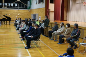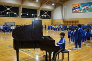 次に、全校合唱として「ふるさとの空」を歌いました。子供たちのきれいな歌声が体育館に響き渡りました。