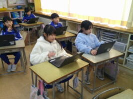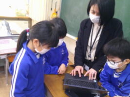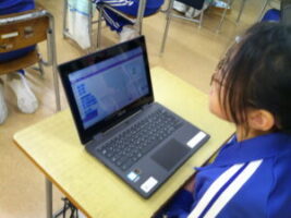 プログラミング学習でスクラッチをしました。プログラミングという言葉を聞いたことはあっても、具体的にはどんなことかよく分からないという子が多かったため、ICT支援員の先生に教えてもらいました。お掃除ロボットはただ掃除をしているのではなく、ここをこのように掃除してというプログラムが入っているという話を聞き、子供たちは「すごいな」「ただゴミを取っているのではないんだ」と驚いていました。その後、スクラッチで猫を動かすというプログラムを作りました。「10歩歩く」「左右に歩く」「ずっと」等様々な指示ブロックを組み合わせて、猫を動かしました。休み時間に、プログラミングに興味をもった子が支援員の先生に質問をする姿も見られました。