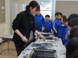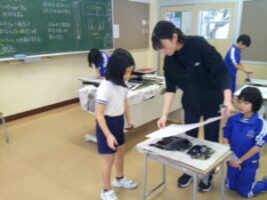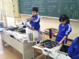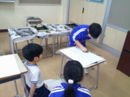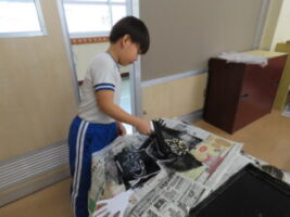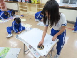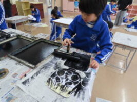 図画工作科「たのしくうつして」の紙版画の学習も終盤にさしかかってきました。顔の部分や胴体、手や腕などこだわって切ったり貼り付けたりして、いよいよインクをつける時が来ました。先生の話をよく聞きドキドキしながら、ローラーで丁寧に黒いインクをつけ、バレンでこする体験をしました。子供たちは満足そうに作品を完成させました。