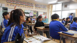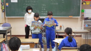 外国語活動では、物の名前を使ったクイズをつくり、みんなで問題を出し合いました。「What’s this?」と問いかけ、自分たちで考えたヒントを3つ伝えます。繰り返し練習をしているため、流暢に伝える姿が見られました。友達が考えたクイズに楽しそうに答えていました。