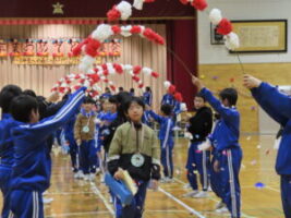 当日は1年生と手をつないだ6年生が、花のアーチをくぐりながら入場しました。
