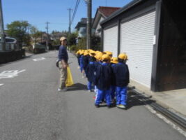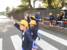 今日は交通安全教室がありました。体育館で警察の方のお話を聞いた後、実際に道路を歩きました。警察の方に教えていただいた①手を挙げる②右・左・右を見る③音をよく聞くの3つを守り、真剣に取り組みました。