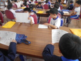 図書室に着くと、司書の西野先生から本を借りるルールや図書室を使う約束があることを教えていただきました。実際に自分で決めた本を1冊借り、本の借り方を知りました。「おもしろい本を借りれた」や「早く借りた本を読みたい。お一人様の時間に読んでいいですか」等、楽しく本に触れ合う子供たちがとても素敵でした。