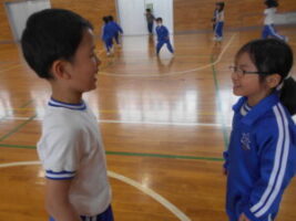 2年生の体育で、体づくり運動「ほめほめおにごっこ」を行いました。鬼にタッチされた友達は、その場でストップ。仲間から「足がはやいね!」「にげるのがじょうず!」「えがおがすてき!」など、ほめ言葉をかけてもらうと復活できます。子供たちは、元気いっぱいに走り回りながら、友達のよいところを見付けて伝え合っていました。運動する楽しさと、友達と関わる嬉しさを感じられる時間になりました。