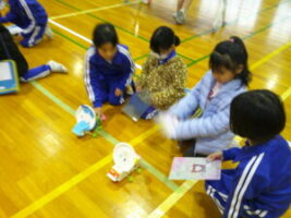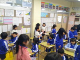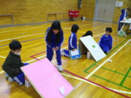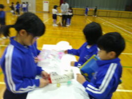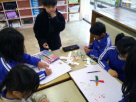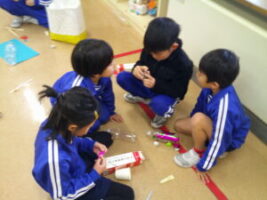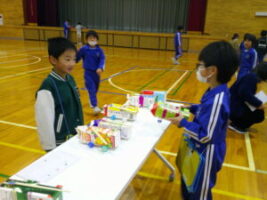 1年生さんに生活科の学習でつくったおもちゃで遊んでもらおうと、おもちゃランドを企画しました。本番当日まで、おもちゃだけでなく、看板や説明書、招待状を一生懸命つくりました。招待状と一緒に折り紙でつくったミャクミャクもプレゼントしました。1年生さんが招待状を見て、「すごく楽しみ」「ミャクミャクかわいい」と言ってくれたので、2年生も気合いを入れ直し、おもちゃの点検をしたり、看板を丁寧に塗ったりしました。いよいよ本番当日。ゴムロケット、びゅんびゅんカー、パタパタカー、ストローアーチェリー、びっくりがえる、ころりん、ぴょんコップ、紙コップ花火、ぷかぷかボール、ブーメランを7つのブースに分け、遊び方を教えました。どのブースも大人気で、2年生は実演を交えて説明したり、「このおもちゃがすいてるよ」と1年生さんを誘ったりしていました。1年生さんが「どのおもちゃもおもしろかった」「またやりたい」と言ってくれ、2年生はみんな大満足でした。