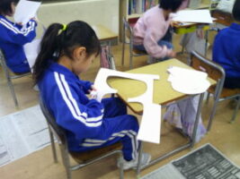 図画工作科の学習で、紙版画をしています。1年生の時にしたローラー版画とどのように違うのか、動画を見ながらやり方を確認しました。顔、首、腕等部品を作って、置き方を変えると雰囲気も変わることが分かりました。イメージを膨らませた後、画用紙に顔や腕を描いたり、切ったりしました。顔は手のひら二つ分くらいの大きさにしようとアドバイスを受け、大きく描きました。どのような作品になるか楽しみです。