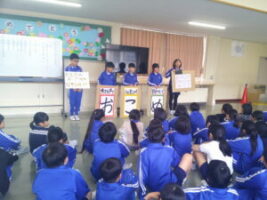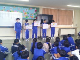 3年生のお兄さんお姉さんたちから、総合の学習の発表に招待していただきました。3年生の総合の学習では、地域の薬勝寺池について調べたそうです。動画や紙芝居、ミニゲームを使い、2年生に分かりやすく楽しく発表する3年生の姿に応えるように、2年生も発表を真剣に聞き笑顔で教室に戻っていきました。次の学年の新しい教科に期待を膨らませています。3年生のみなさんありがとうございました。