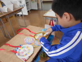 新しく入学してきた1年生に向けて、2年生が「入学おめでとうメダル」をつくりました。昨年は自分たちがしてもらったことを思い出しながら、「よろこんでくれるかな」「どんな色がいいかな」と、1年生のことを考えて一つ一つ丁寧につくりました。完成したメダルを手にした子供たちは、「早く渡したいな」「喜んでくれるといいな」と、1年生に渡す日を楽しみにしている様子でした。これから、2年生として1年生をやさしくサポートしていく姿が楽しみです。